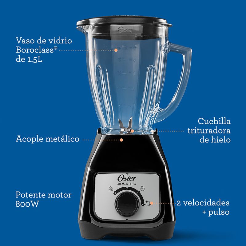 | Descripción | La licuadora Oster® con control de perilla y su potente motor 4 veces más duradero*** con 800 W de potencia* te ayuda a preparar deliciosas y saludables recetas. Con alta fuerza de torsión, acople metálico 10 veces más fuerte****, revolucionaria cuchilla trituradora de hielo y vaso de vidrio Boroclass® resistente a ingredientes hirviendo** es ideal para preparar una amplia variedad de recetas frías y calientes, jugos, batidos y mucho más.