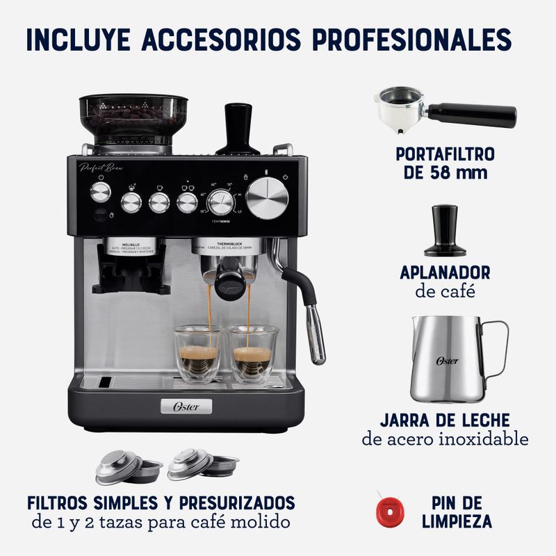 Oster Cafetera Perfect Brew, de Espresso, con Molinillo de Muelas, Tubo de Vapor Tempsense, Porta filtro de 58 mm, Accesorios Incluidos, BVSTEM7301
